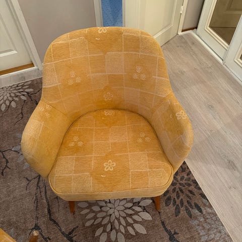 Kulumaa, halkeamia ja ajan patinaa löytyy, mutta ei haittaa istumista.