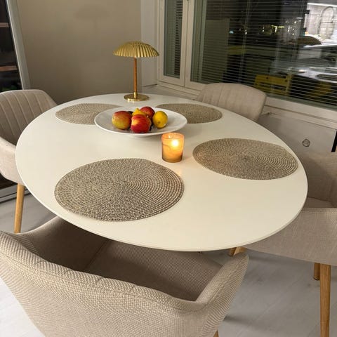 Ruokapöytä ja 8 tuolia.