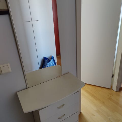 Annetaan kuvan puinen lipasto. Alimman hyllyn kisko putoaa ulos vedettäessä, todennäköisesti muutamalla ruuvilla korjattavissa. Vain nouto.