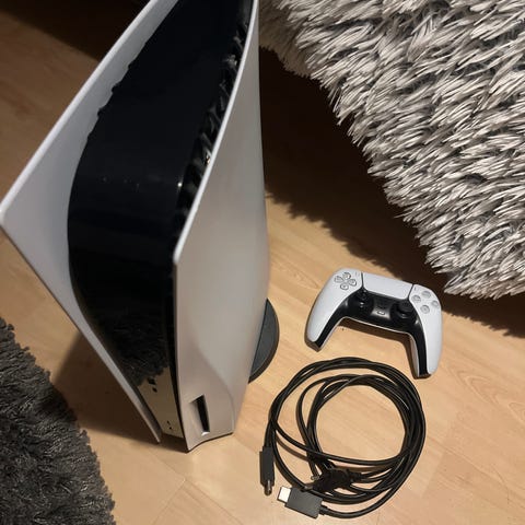 Sony PlayStation 5 pelikonsoli oheislaitteineen. Kokonaisuuteen kuuluu PS5-konsoli, kaksi DualSense-ohjainta, PlayStation VR2 -virtuaalilasit sekä kaksi VR-liikeohjainta. Playseat ajoistuin FANATEC ratin ja polkimien kanssa, sekä GranTurismo 7 ajosimulaattori-peli. Mukana virtakaapeli ja muut tarvittavat johdot kuvien mukaisesti.