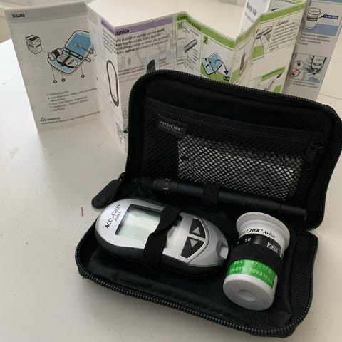 Myös Verensokerin testiliuskoja /Lansetteja jäänyt ylimääräiseksi.