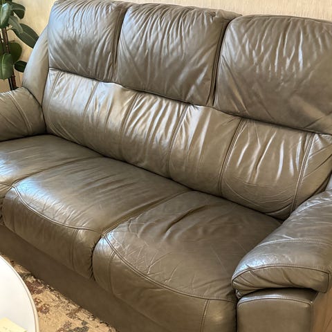 Sohvan kankaassa näkyy kulumaa.