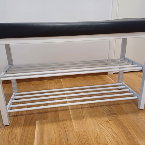 Hyväkuntoinen käytetty penkki / kenkähylly on kätevä kaluste eteiseen. Pehmustetulla istuimella on mukava pukea kengät ja sen alapuolella on säilytystilaa kauden käytetyimmille kengille.