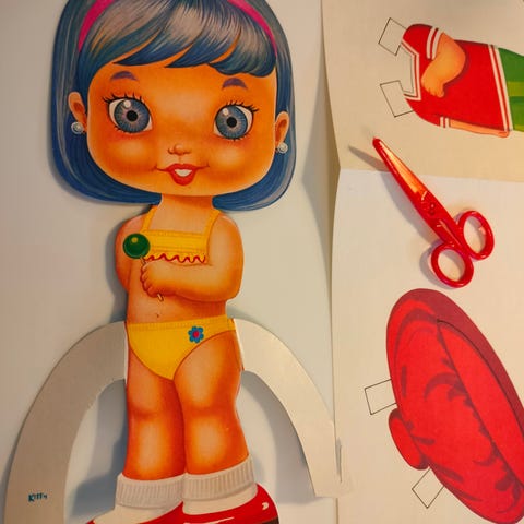 Huonokuntoinen tyttö paperinukke 21 cm paljon teippiä takana j edessä .kirjrmakfu 2.75