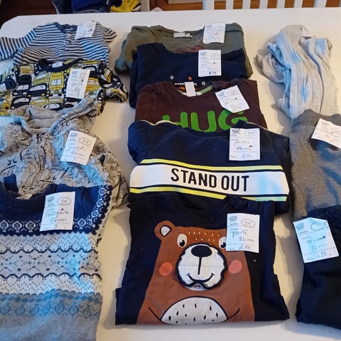 2 kauluspaita, autopaita + paita, 2 neuletakki, haistoi paita, fleece paita, 3 housut
