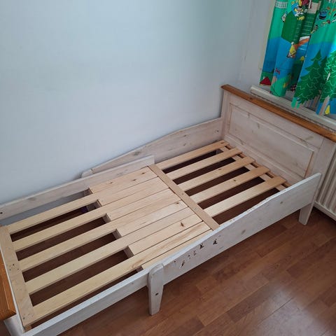 Annetaan lasten päästä vedettävä sänky, sälepohja. Sängyn pohjan tukipuuta korjattu metallilla.
