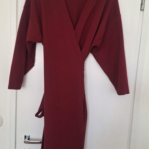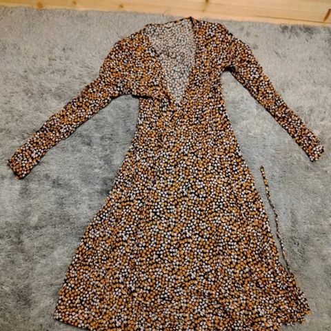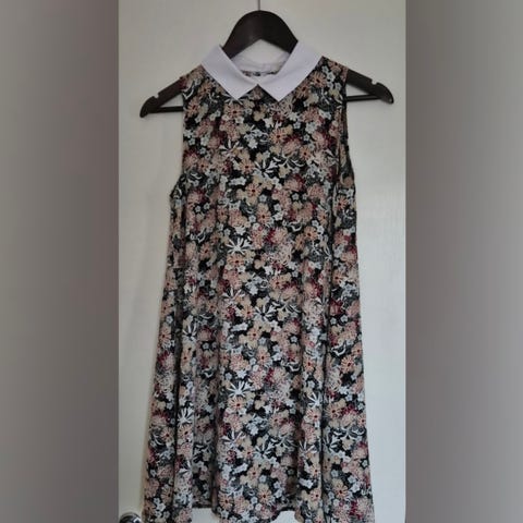 Kietaisumekko, koko XS, valkoisia ja vaaleanpunaisia pilkkuja mustalla pohjalla.