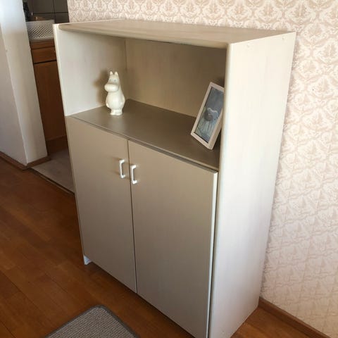 Valkoinen, kaksiovinen lipasto/senkki/kaappi esim. eteiseen.
