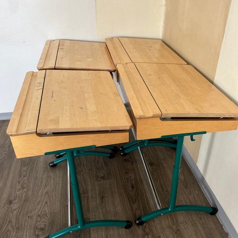 Puinen, valkoinen koulupulpetti, jossa kiinteä penkki kahdelle. Pulpettiosassa on kaksi erillistä, ylös avattavaa kantta säilytystilalla. Penkissä on selkänojat ja sivuilla tukevat jalkaosat. Pulpetissa näkyy ajanpatina, joten kaipaa mahdollisesti maalia.