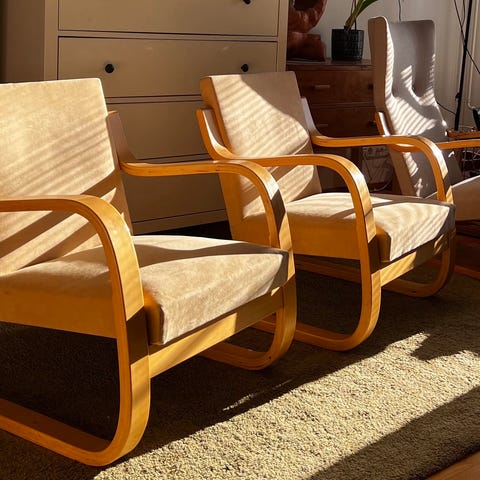 Artek nojatuoli, suunnittelija Alvar Aalto. Tuolissa on taivutetusta koivusta valmistettu runko ja käsinojat sekä verhoilu zebra-kuosisella kankaalla istuimessa, selkänojassa ja tuolin takaosassa. Sopii käytettäväksi esimerkiksi olohuoneessa tai työtilassa istuin- ja lepotuolina.
