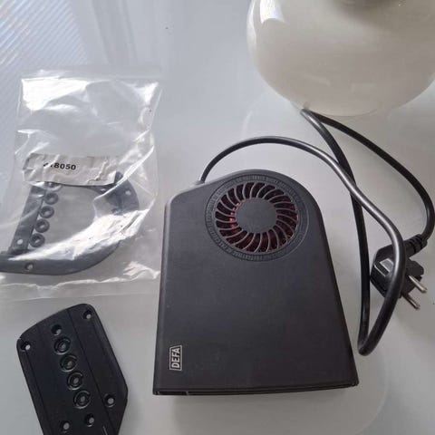 Defa auton sisätilanlämmitin. Väri musta. Tarkoitettu auton sisätilojen lämmittämiseen osana Defa-sähkölämmitysjärjestelmää. Lämmitin kytketään verkkovirtaan ja se puhaltaa lämmintä ilmaa auton matkustamoon. Sopii käytettäväksi esimerkiksi talviaikaan auton sisätilojen esilämmitykseen ja huurteen poistoon ikkunoista. Tekniset tiedot, kuten teho ja mitat, kannattaa tarkistaa laitteen tyyppikilvestä tai valmistajan ohjeista.