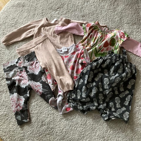 Tytön vaatepaketti koossa 74. Siistit käytetyt vaatteet, jotkut enemmän, jotkut vähemmän käytetty. Ei ole uudenveroisia. Bodyt, paidat, sukkahousut, mekot. Me&i, disney, pop&go, newbie, h&m.