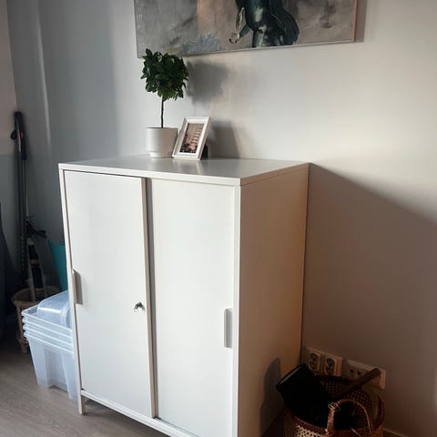 Seinään kiinnitettävä lipasto. Sisällä neljä hyllyä.