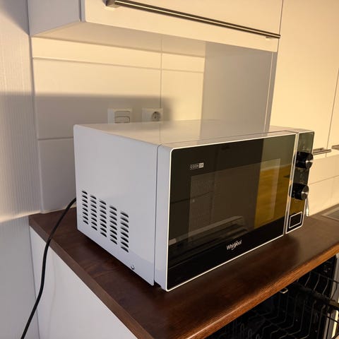 Whirlpool valkoinen mikroaaltouuni. Laitteessa on etupaneelissa mekaaniset/nappisäätimet ja ovi avautuu sivulle. Sisällä on irrotettava lasinen pyörivä lautanen. Soveltuu ruoan lämmittämiseen, sulattamiseen ja yksinkertaiseen kypsentämiseen kodin keittiössä.
