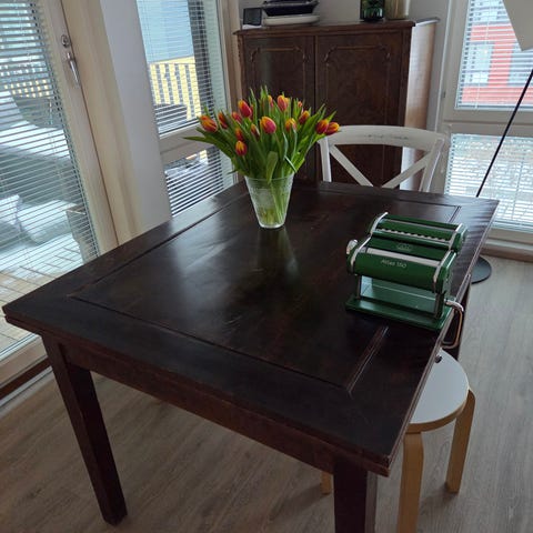 Muuten pöytä on hyvässä kunnossa, mutta yksi jaloista on aiemmin korjattu ruuveilla, minkä seurauksena puu on hieman haljennut (ks. viimeiset kuvat). Tämä ei ole kuitenkaan haitannut käyttöä eikä ole vaikuttanut pöydän vakauteen.