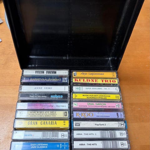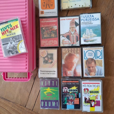 Nyt kasettikeräilijälle nannaa tarjolla! 60kpl C-kasetteja vetävä tyylikäs (90-luvun alun mittapuulla) salkku sekä aimo pläjäys laadukasta musiikkia C-kaseteilla! Tummanvihreä erinäisistä muovimateriaaleista, kartongista(?) ja metallista valmistettu salkku on kooltaan 49x34x8cm. Se vetää sisäänsä muhkeat 60 C-kasettia ja siinä on lukolliset salvat, jotteivät kaikki pääse turhaan kasettiaarteitasi hipelöimään! Lukkojen avaimet (2kpl) ovat tallessa ja mukana. Kasetit ovat pääosin jenkkiläistä kasaria, ihan laadukkaan oloista 80-lukumenoa, ei mitä tahansa hittikokoelmia. Mukana seuraavia bändejä tai artisteja: Talking Heads, Elvis Costello, Anita Baker, Joe Jackson, Stan Getz, Zapp, Trouble Funk, Enya, Louis Armstrong, Lillo Thomas, George Winston, Chris Rea, Joyce Sims, Donny Osmond, Aswad, Shakatak, Billie Holiday, Nina Simone, Roberta Flack, Gil Scott-Heron, Hot Chocolate, Shamaani Duo, Thelonius Monk, Big Chill soundtrack, Clannad, Gipsy Kings ja pari kokoelmaa. Muutama kaseteista on joko piraatteja tai jonkinmoisia masterkasetteja. Kunto näyttää olevan pääosin hyvä tai ainakin kohtalainen. Yhteishinta koko paketille 60€. On mahdollista ostaa salkku erikseen hintaan 35€ tai kasetit erikseen hintaan 35€. Yksittäisiä kasetteja en mielellään ala diilailemaan ellei erityisen hyviä tarjouksia tule.
