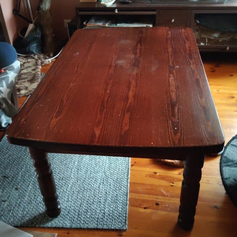 Pöydän pinnassa jonkin verran käytön jälkiä, katso kuvat. Pinnan voi helposti käsitellä värillisellä vahalla. Pöytä on mittatilaustyönä teetetty ja pienet halkeamat kuuluvat asiaan.