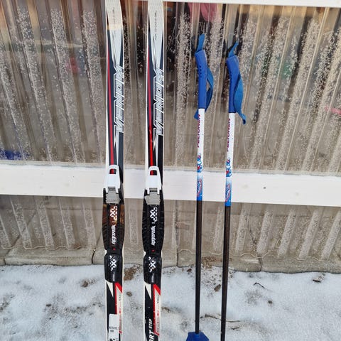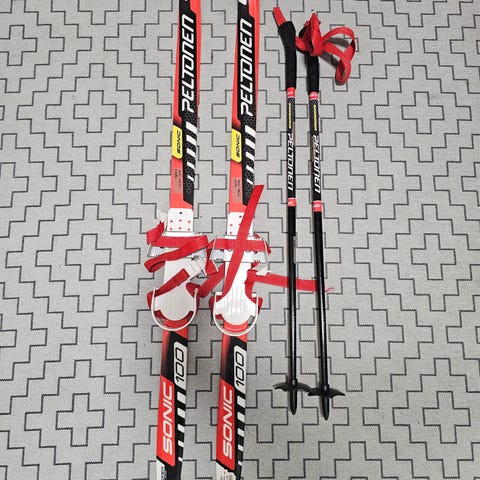 Sukset 100cm (Tecnopro), sauvat 85cm (Edsbyn). Sukset huoltovapaat, grippipohja. SNS-side. Perussiistit, mutta käytön jälkeä. Vain nouto.