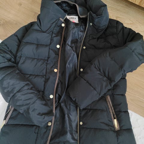 ONLY naisten talvitakki, koko S, väljä malli. Pitkä, tikattu malli, väri musta. Takana helmassa kolme pientä palo jälkeä, ei näy käytössä. Pesty takki ja täytteet hyvässä kunnossa.