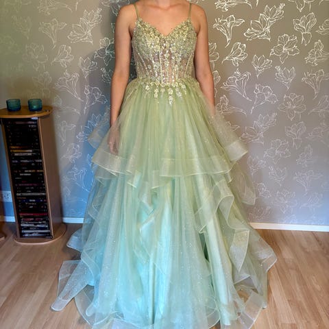Zazabella ilta- tai juhlapuku, koko S/34. Sininen sifonkinen mekko, jossa kerroksellinen, runsas helma ja olkaimellinen yläosa. Yläosassa koristeellinen, kimaltava pinta ja V-pääntie. Sopii naiselle juhla- ja iltatilaisuuksiin, kuten vanhojentansseihin, valmistujaisiin tai muihin juhliin.