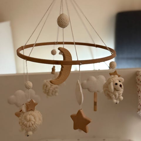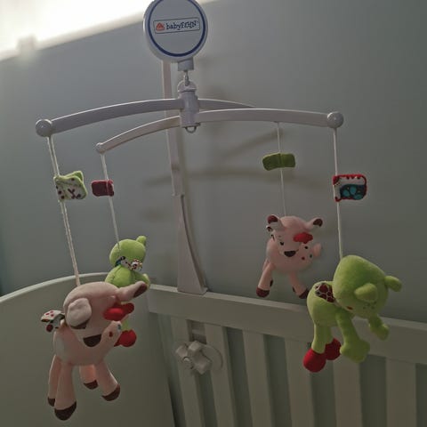Sängyn reunaan kiinnitettävä soiva mobile. Kiinnitetään kiristystoiminnolla.