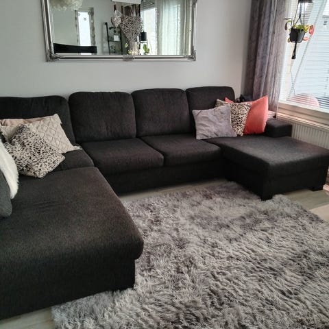 Sotka kulmavuodesohva harmaalla kangasverhoilulla. Sohva on U-mallinen kulmasohva, jossa on useita selkätyynyjä ja leveät käsinojat. Sohvasta löytyy molemmista kulmista säilytystilat. Verhoilu on tasaisen harmaa ja kuvissa näkyy käytön jälkiä istuinosissa, lähtisivät varmaan tekstiilipesurilla mutta en itse omista. Hinta on soviteltavissa!