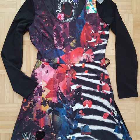 Desigual mekko, koko L. Monivärinen, kirjava kuosi, jossa vihreitä ja pinkkejä kuvioita mustalla pohjalla. Pitkähihainen malli, pituus noin polvipituinen. Sopii arki- tai vapaa-ajan käyttöön.