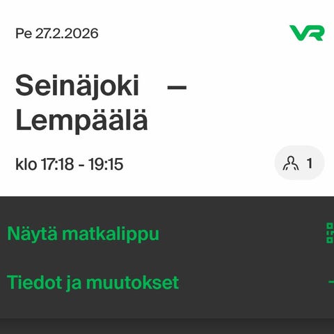 Seinäjoki - Tampere -Lempäälä pe 27.2. klo 17.18-19.15