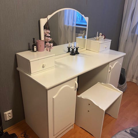 Ikean Hemnes-peilipöytä. Muuten todella hyvässä kunnossa, mutta toisen laatikon kahva on löysällä ja yksi nurkka on ottanut pientä osumaa. Lasissa on muutama pieni tahra/jälki, jotka näkyy tietyssä valossa. Maksu käteisenä 😊