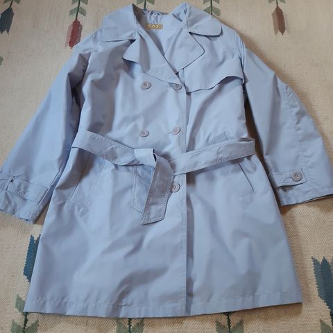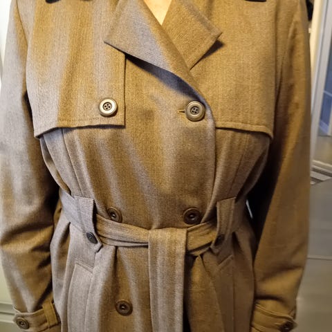 Erittäin hyvässä kunnossa oleva ruskea trenssitakki! Koko 44. Toiseksi viimeisessä kuvassa näkyy materiaalit: 100% polyesteriä lining ja 75% virgin wool ja 25% polyamidi.