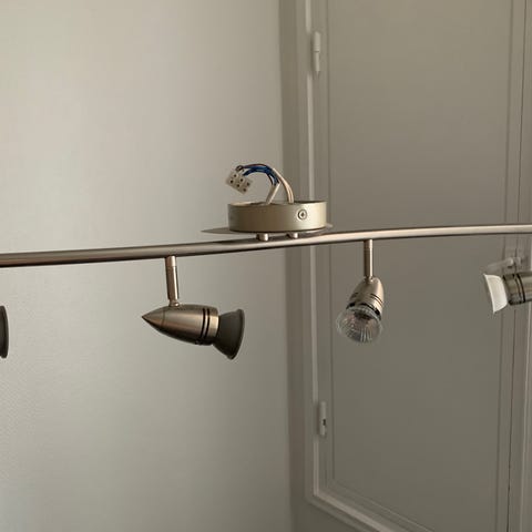 Kattoon asennettava krominvärinen spottivalaisin. Kunto hyvä, lukuunottamatta keskimmäisessä lampussa olevia ruostetahroja (kuvassa).