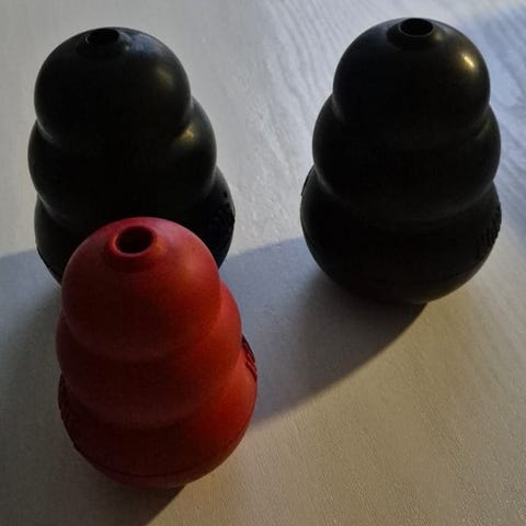 Kaksi isoa koiran kongia. Jonkin verran pieniä hampaan jälkiä löytyy mutta ajaa täysin asiansa. Muuten siisti kunto. Molemmat yhdessä 12e!
