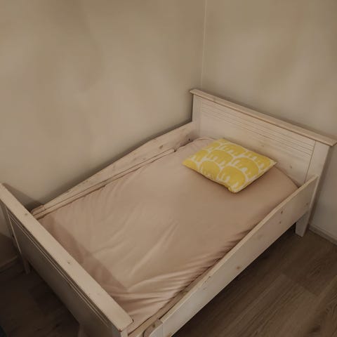 Myydään jatkettava lasten sänky tällä hetkellä noin 900x1250. Päädyn korkeus noin 600. Siistit patjat kuuluvat mukaan.