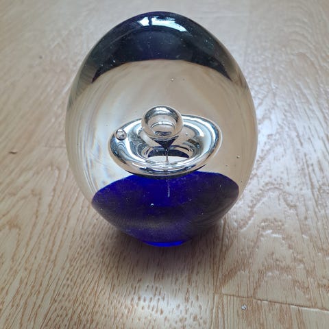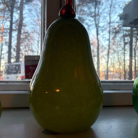 Myydään lasinen sininen omenakoriste. Pohjassa Jussis Tervakoski signeeraus. Korkeus on noin 14 cm.