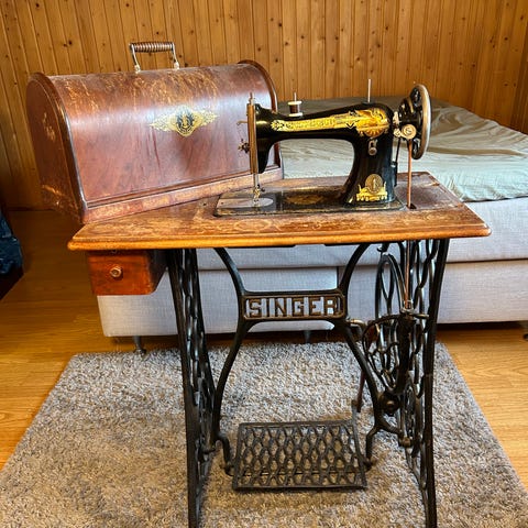 Singer ompelukone pöytätelineellä. Mekaaninen poljettava ompelukone, jossa musta runko ja kultaiset merkinnät. Kone on upotettu puiseen pöytään, jossa on kansi koneen suojaamista varten sekä vetolaatikko tarvikkeille. Jalusta on metallia ja sisältää poljinmekanismin. Mukana on ohjekirja mallille Singer No. 15K88. Tarjoa, jos hinta ei miellytä. Vain nouto.