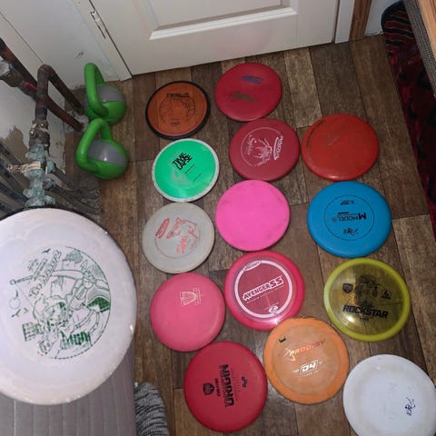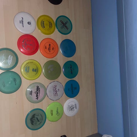 Eri valmistajien frisbeegolf kiekkoja frisbeegolfin harrastamiseen. Frisbeet ovat jo osa vuosien takaa. Viimeisimmät hankittu noin 3-4 vuotta sitten ja osa jo paljon ennen sitä, jopa 10 vuotta vanhoja. Näin ollen joitakin kivoja helmiä myös mukana.
