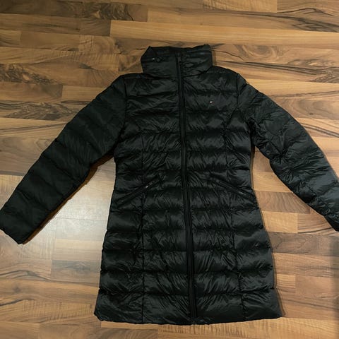 Naisten musta TommyHilfiger kevyt toppa takki kokoa M. Takin hupun saa vetoketjulla piiloon takin kaulukseen (kts kuva). Takin takaosassa on vyötäröllä joustava kiristys rypytys. Vain Postitus.