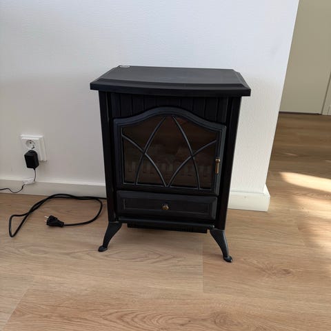 Myydään sähkötakka, jossa musta lasipinta. Soveltuu sisäkäyttöön tuomaan tunnelmavalaistusta.