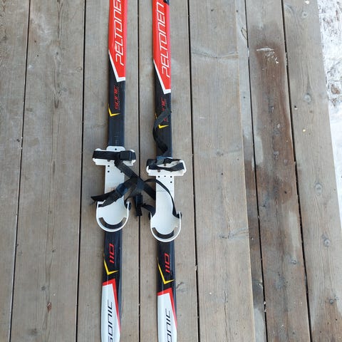 Lasten kokonaan muoviset sukset ja sauvat. Suksen pituus 60 cm. Muovisiteet kiinnitetään kenkien päälle remmeillä.