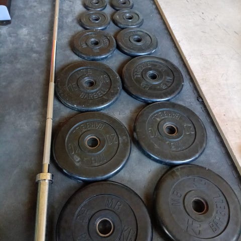 Levytanko ja painoja kevyeen kotitreeniin.
