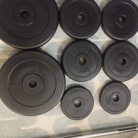 Painokiekkoja löytyy seuraavasti: 4 X 10kg, 2 X 5kg, 2 X 2,5kg, 2 X 1,25kg. Settiin kuuluu myös mutterilukot, unohtu kuvista.