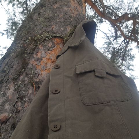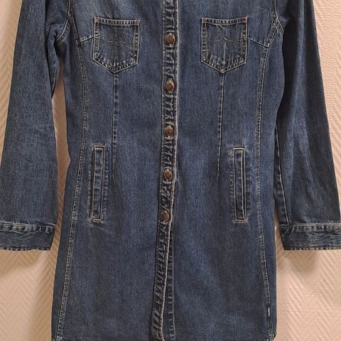 Pitkä vintage farkkutakki, koko M. Sininen, farkkumainen malli, valmistettu puuvillasta. Edessä nappikiinnitys ja useita taskuja. Sopii käytettäväksi pitkänä takkina arkeen tai kerrospukeutumiseen. Retro, luultavasti 80- tai 90-luvulta. Helmassa takana pientä tummaa, luultavasti vain likaa joka lähtee pesemällä.