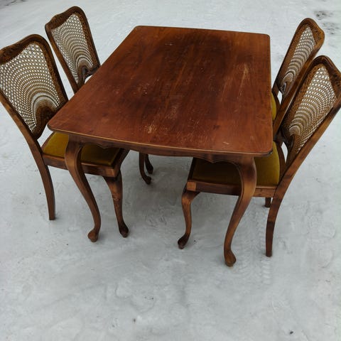 Pyöreä puinen ruokapöytä noin -50 luvun puolivälistä, jonka pinta on maalattu vaaleanvalkoiseksi. Pöydässä on sorvatut jalat ja yksi vetolaatikko sivussa pientä säilytystä varten. Pöydän kannessa on käytön jälkiä ja kulumaa maalipinnassa. Sopii esimerkiksi keittiön tai ruokailutilan pöydäksi. Ei ole jatkettava. Jalat ei irtoa, ainakaan helposti.