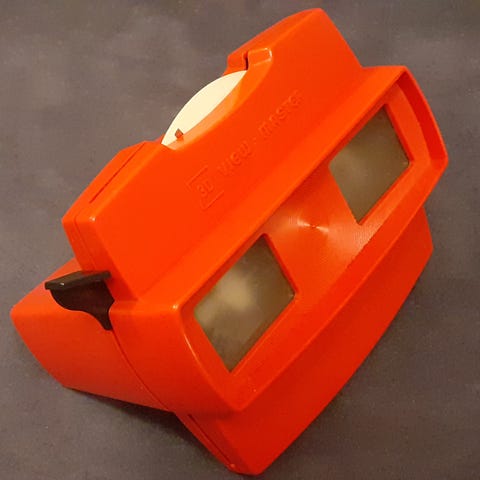 View Master Junior Projektori. Luultavasti 1950-60 -lukujen taitteesta. Mustaa bakeliittia/metallia. Vaatii puhdistuksen ja uuden lampun. Tällä voidaan heijastaa valkokankaalle View Masterkiekkoja. Kiinteä sähköjohto.