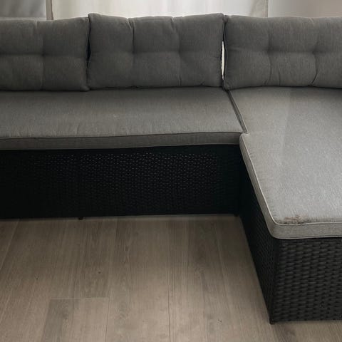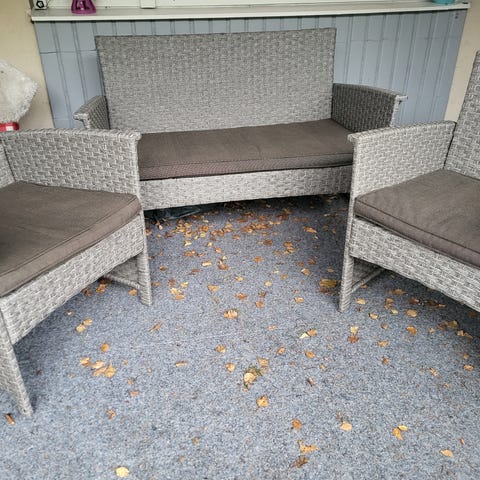 Polyrottinkinen puutarhakalustesetti, johon kuuluu kaksipaikkainen sohva, kaksi nojatuolia ja suorakaiteen muotoinen pöytä. Kalusteet ovat harmaata polyrottinkia ja soveltuvat ulkokäyttöön esimerkiksi terassille tai parvekkeelle. Pöydässä on tasainen pinta tarjoilua tai tavaroiden säilytystä varten. Setti tarjoaa istumapaikat useammalle henkilölle ja on suunniteltu ulkotiloihin.