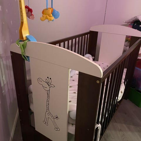 Mukaan saa halutessaan vaahtomuovipatjan, joka on hieman liian lyhyt sänkyyn. Sopivan patjan voi varmaan myös leikata äitiyspakkauksen patjasta. Sänkyyn on myös vaaleanpunainen reunapehmuste.
