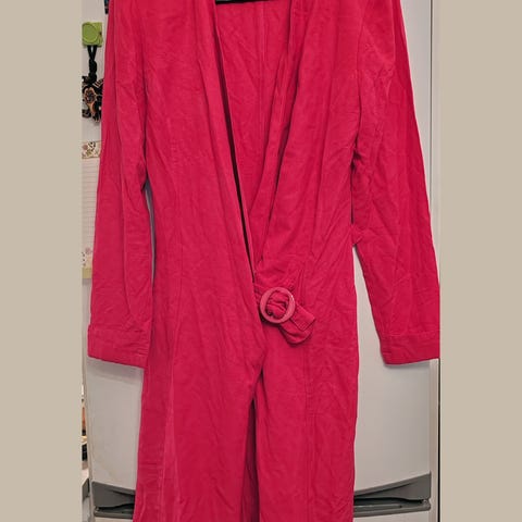 Ranskalainen kasarimekko, jossa epäsymmetrinen leikkaus. Kangas hyvin laskeutuvaa ja kiiltävää viskoosiasetaattia. Vyötäröllä kuminauhapoimutus joten mekko puetaan pujottamalla päälle (ei vetoketjua). Taskut edessä, halkio takana, olkatoppaukset puuttuvat. Ehjä ja siisti. Alla on ainakin kovassa juhlinnassa syytä käyttää alusmekkoa.