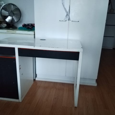 Paljon käytön jälkiä. Pöytälevyssä länttejä jotka ei lähde irti, myös muita jälkiä. Magneettilevyt kulmassa.