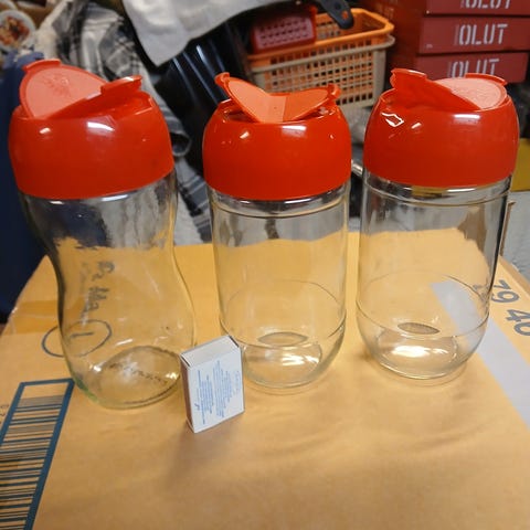 Erittäin hyväkuntoiset pienet metallikantiset lasipurkit 5 kpl. Korkeus n. 7,5 cm kannen kanssa. Vetoisuus n. 1 dl. Tiivis kansi. Hinta yhteensä 4 €. Nouto tai postitus. Postikulut ostajalle.