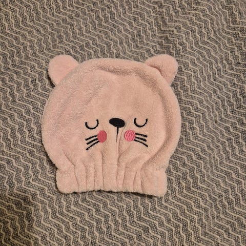 Myydään söpö lasten tukkapyyhe nallenkorvilla. Materiaali vaaleanpunaista vohvelikangasta. Sanoisin, että on sopiva alle 5-vuotiaalle.